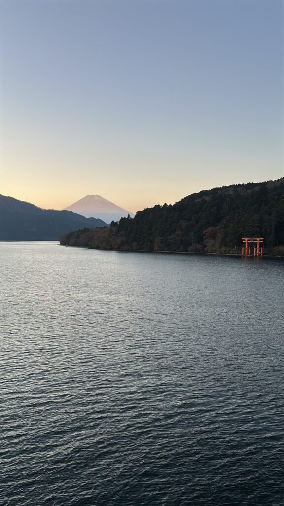 その後は芦ノ湖で船に乗り🚢、湖面に映る紅葉や、運が良ければ見える富士山を眺めながら、ゆっくりとした時間を過ごしました。湖に浮かぶ鳥居や箱根神社の赤い門も美しく、まるで絵の中にいるような気分になりました。🌄