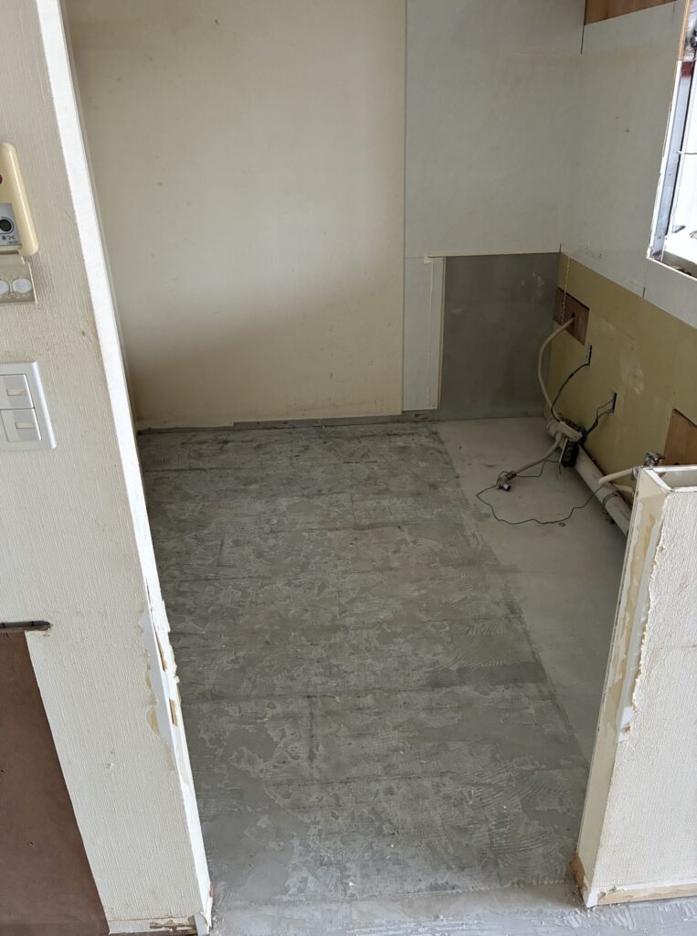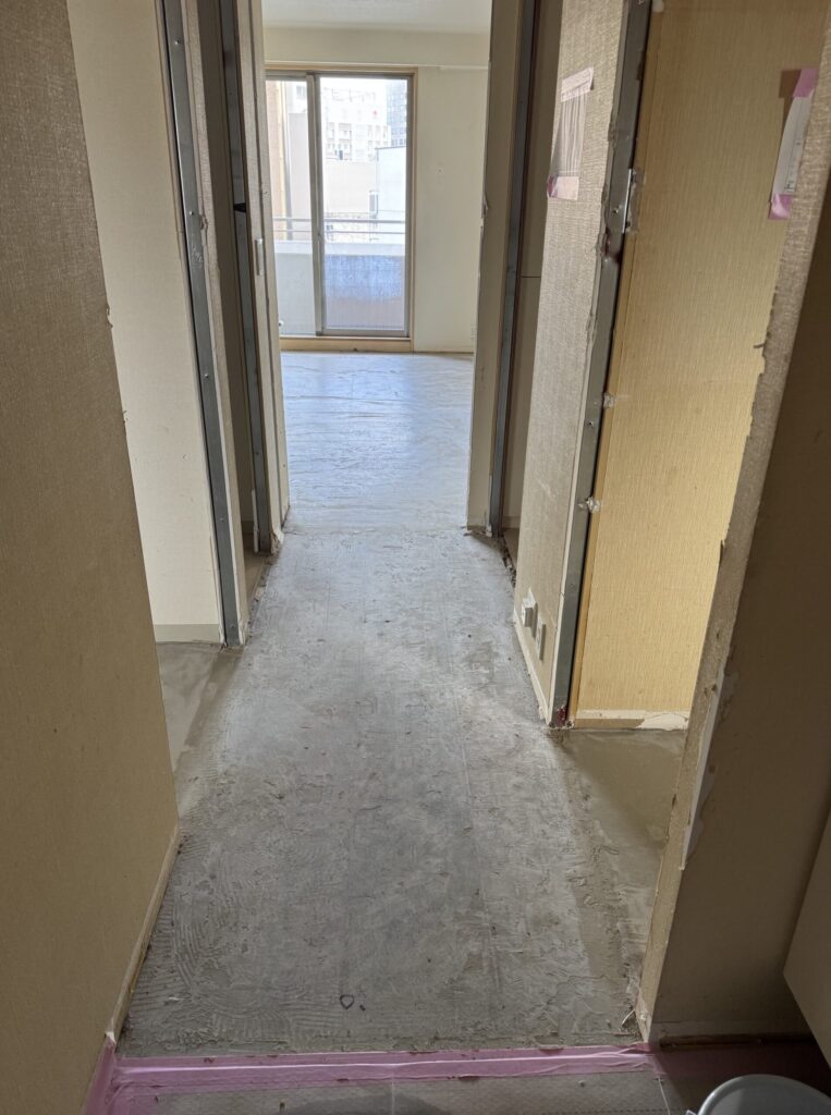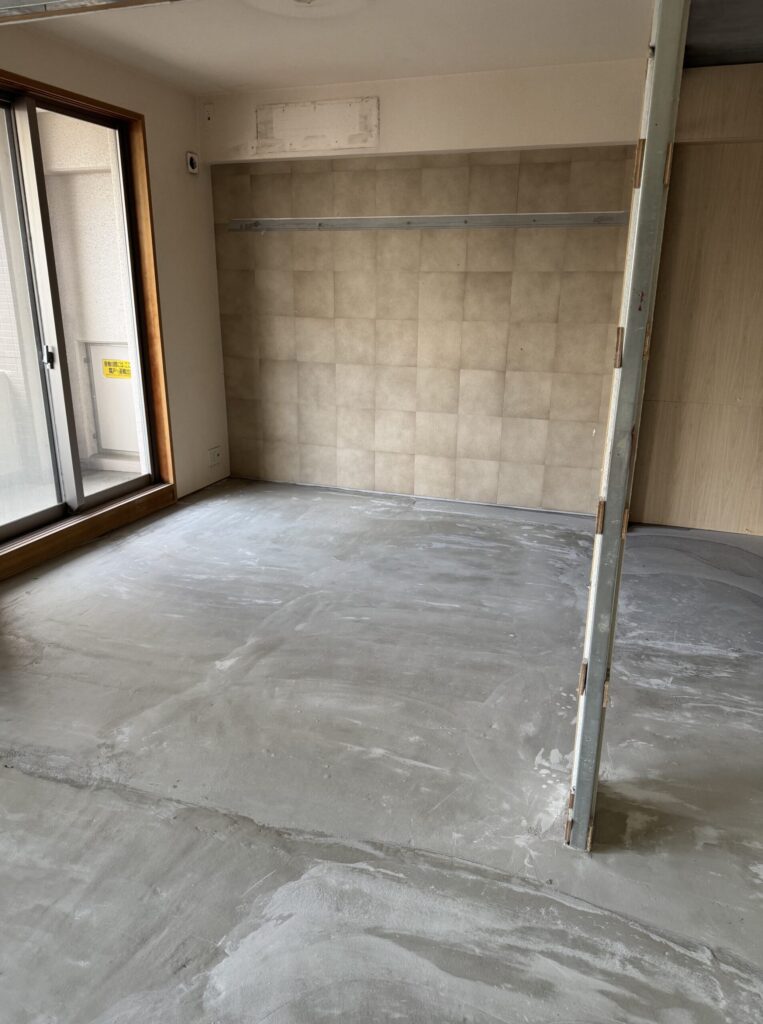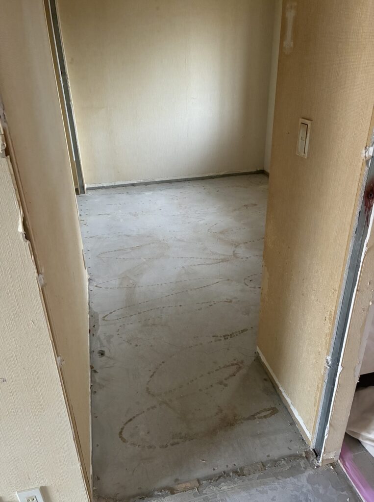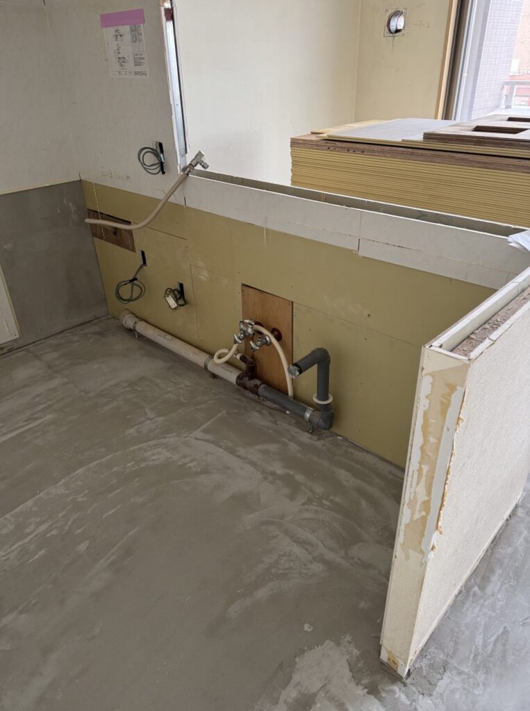 給排水のルートや不陸(凹凸)をチェックした上で、**レベラー施工(セルフレベリング材)**を行い、床面の精度を整えています。
